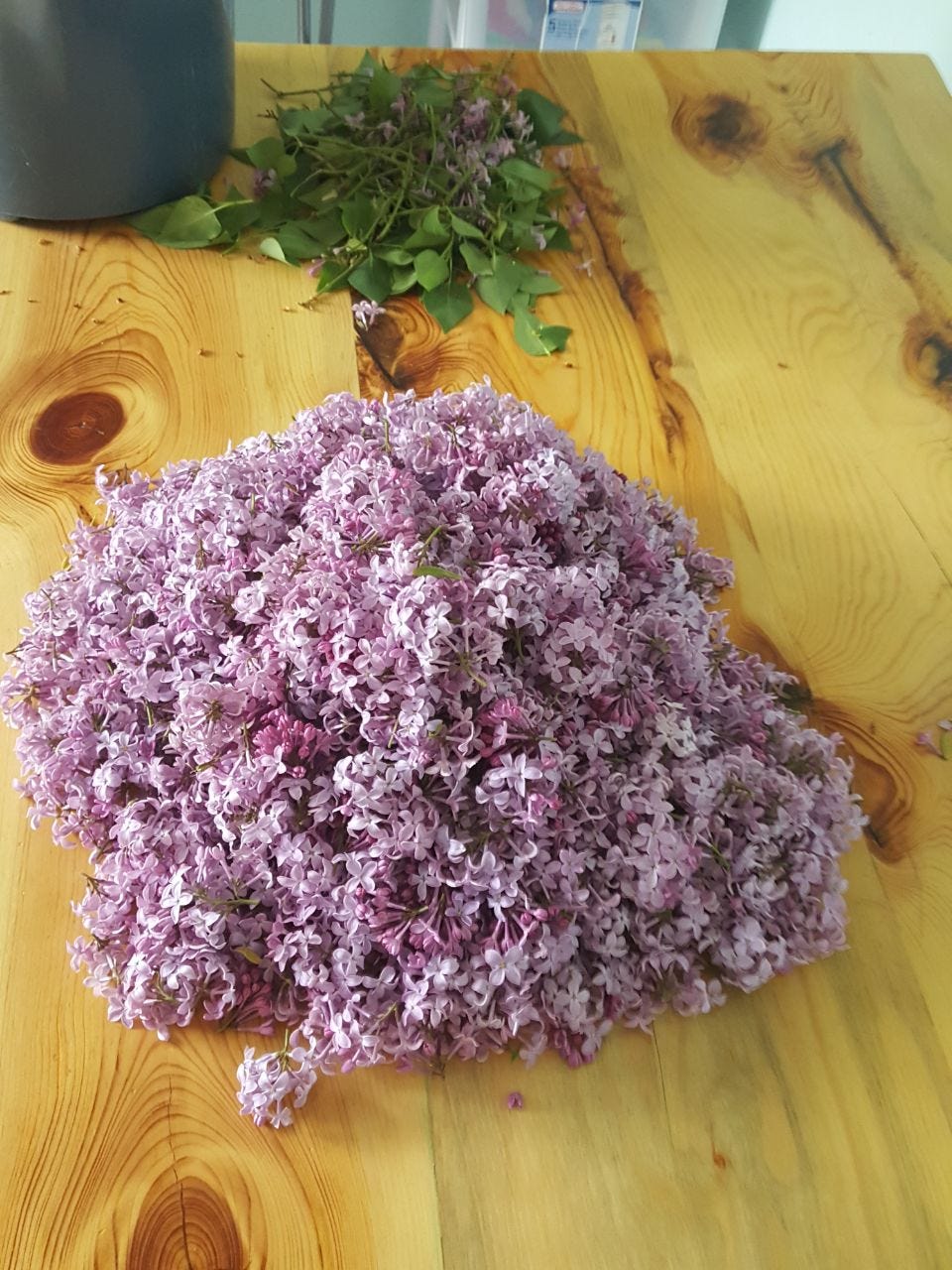 This is the second flower wine I plan to produce this year. Lilac flowers blossom in spring. In Saskatchewan that is around mid to end of May, depending on the year. It is very easy to find stands of common purple Lilac bushes in public areas. I found a luscious group of bushes in a valley within 10 minutes of my home. The tiny 4 petalled flowers are produced in small clumps which I am going to refer to as umbels. The umbels join to a common stem to form the beautiful spikes or panicles that we refer to collectively as the flowers. You may use scissors or sharp pruning shears to separate the spikes from the stems. I select spikes which have most of the flowers open (at the time I was picking there were not many spikes that had a least a few of the flowers closed at the tip). The spikes are quite large (4 or 5 inches long) and contain many umbels. I collected the spikes in a plastic pail. They are quite fluffy and I wouldn’t have been able to fit enough into my pail unless I pushed them down to remove some of the air spaces between the flowers.